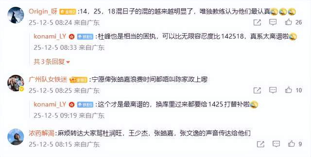 看到这3人的表现,广东球迷忍不了,直言他们都是混日子的,“混日子的混的越来越明显了,唯独教练认为他们最认真”、“杜峰也是相当的固执,可以比无限容忍度比142518,真系太离谱啦”、“麻烦转达大家骂杜润旺,王少杰,张皓嘉,张文逸的声音传达给他们”。