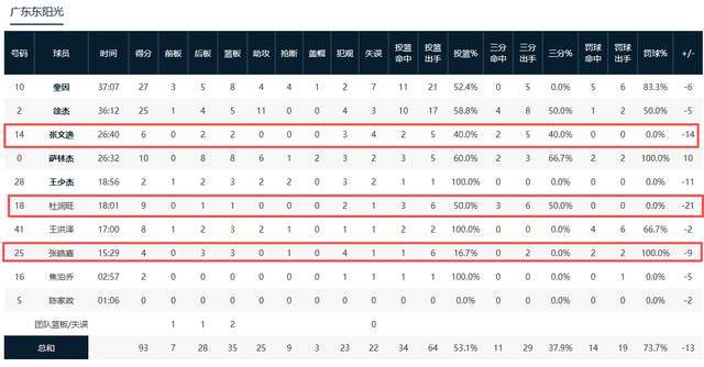 杜润旺替补登场打了18分钟,6投3中,全部也是来自三分球,拿到9分1篮板2犯规1失误,投篮命中率50%,正负值-21,全队倒数第一。